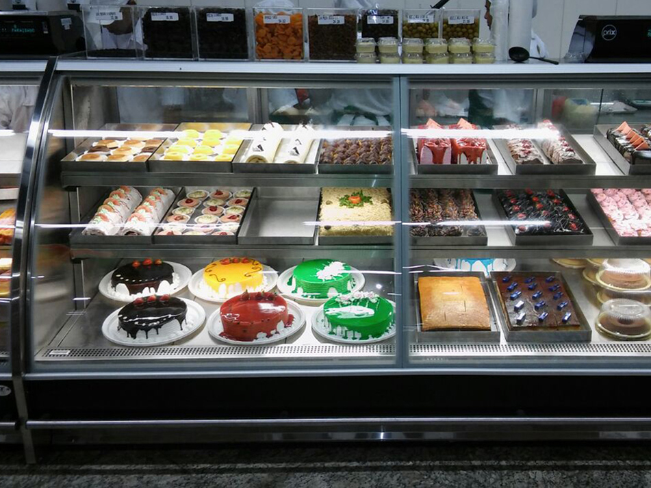 Balcón vidrio curvo enfriado con 2 estantes para pasteles y pasteles