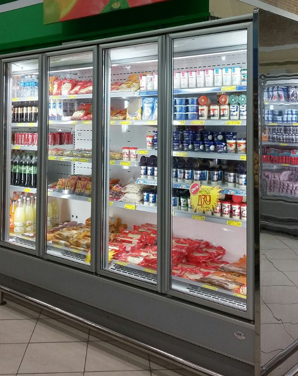 - Possibilidade de fechamento frontal através de sistema de portas de vidro termo-isolante de projeto próprio, caracterizadas por um sistema de articulação isento de molas ou barras de torção, o que garante a isenção da necessidade de manutenção no sistema de abertura das portas